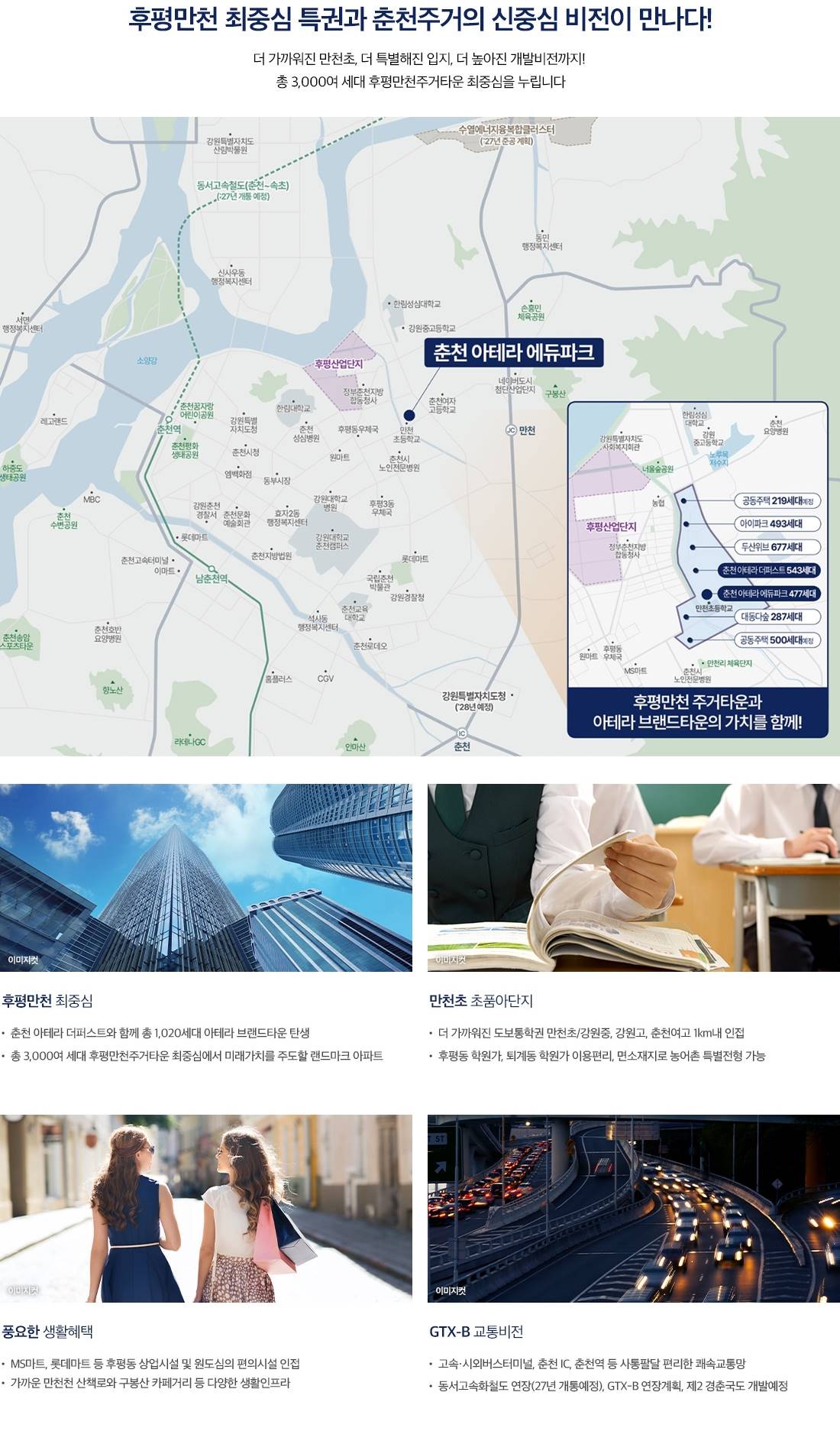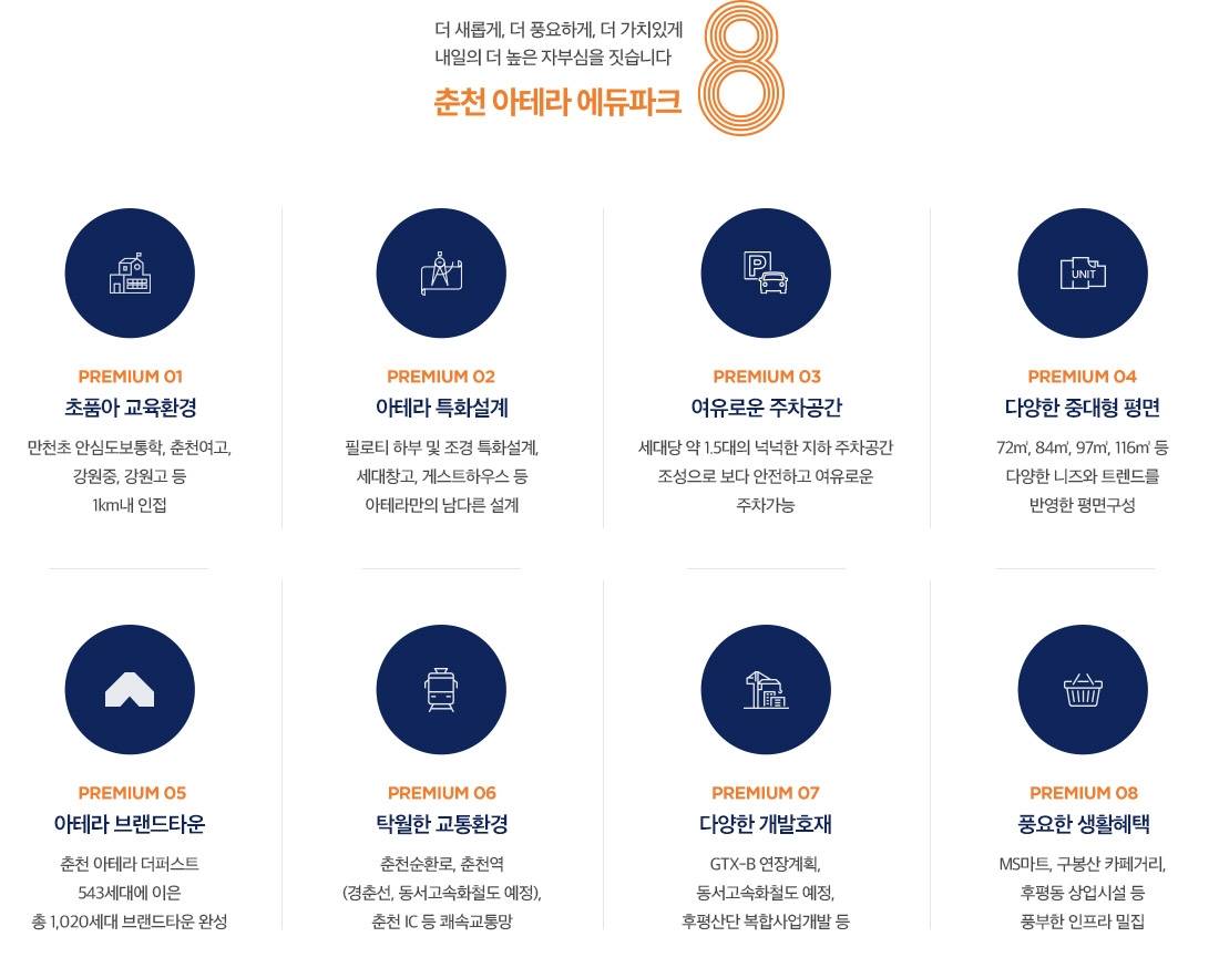 춘천의 중심을 누리는 어반 라이프 인프라와 자연을 동시에 소유하는 주거의 새로운 기준 교통, 교육, 생활 편의시설이 집중된 입지에서 동문건설의 브랜드 가치가 더해진 고품격 주거 환경을 선사합니다. 압도적 쾌속 교통의 허브 남춘천역과 춘천역 인접 및 광역 교통망의 중심 중앙고속도로와 서울양양고속도로 접근이 용이하며 수도권과 춘천 전역을 빠르게 잇는 사통팔달 교통망을 확보했습니다. 풍요로운 숲세권 힐링 라이프 공원과 숲이 맞닿은 단지에서 누리는 쾌적한 일상 단지 인근의 풍부한 녹지 공간과 공원을 통해 도심 속에서도 맑은 공기와 자연의 여유를 만끽할 수 있습니다. 안심하고 맡기는 명품 교육 환경 도보권 내 위치한 우수한 학군과 교육 시설 안전한 통학이 가능한 교육 환경을 갖추어 아이들의 미래와 부모님의 마음까지 세심하게 배려한 학세권 단지입니다. 공간의 효율을 높인 특화 설계 혁신적인 평면과 트렌디한 인테리어의 조화 동문 디이스트만의 공간 철학을 담아 채광과 통풍을 극대화하고 수납 효율을 높인 스마트 평면을 실현했습니다. 삶의 질을 높이는 프리미엄 커뮤니티 다양한 라이프스타일을 지원하는 고품격 부대시설 피트니스, 실내 골프연습장, 작은 도서관 등 입주민의 건강과 문화를 책임지는 수준 높은 커뮤니티를 완성합니다.